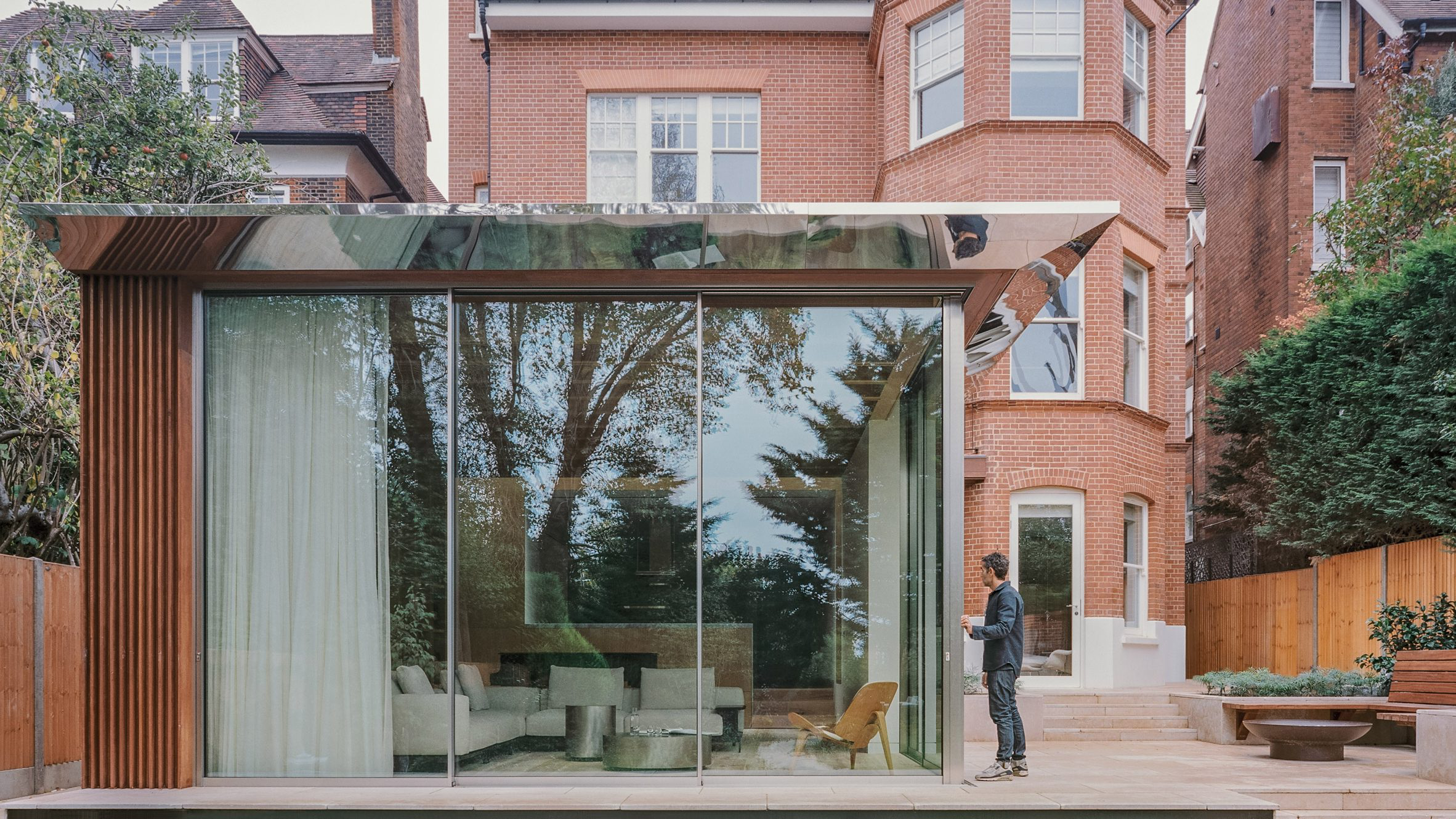 Local studio Mata Architects has extended a family home in Hampstead, London, with a timber-clad building featuring a glazed corner and an overhanging roof.
